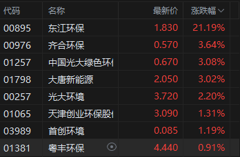 环保股全天涨幅居前,东江环保涨超20%。消息面上,中共中央、国务院印发的《关于加快经济社会发展全面绿色转型的意见》正式对外公布。《意见》提出一系列目标:到2030年,节能环保产业规模达到15万亿元左右;非化石能源消费比重提高到25%左右;营运交通工具单位换算周转量碳排放强度比2020年下降9.5%左右;大宗固体废弃物年利用量达到45亿吨左右等。