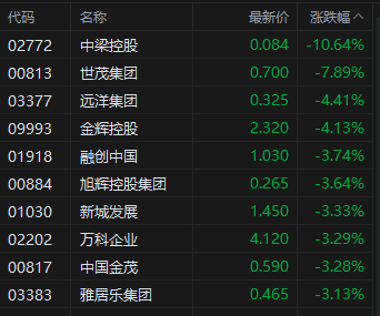 内房股纷纷走低,世茂集团跌近8%。消息面上,据中指研究院,上周楼市整体环比下降42.65%,同比下降27.38%。各线城市整体同环比涨跌节奏一致,二线城市环比跌幅最大,杭州领跌,跌幅为84.3%。库存整体无明显